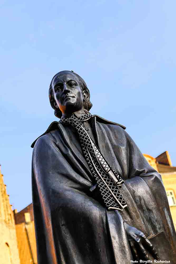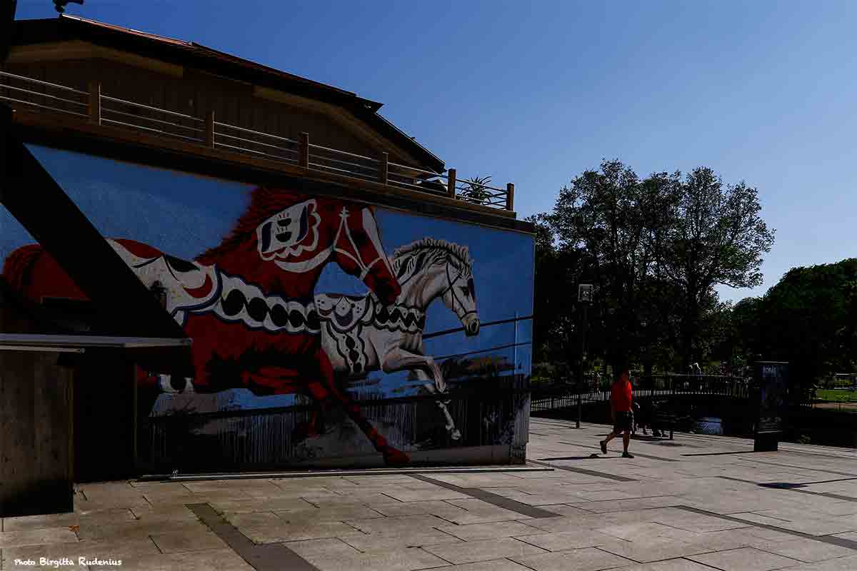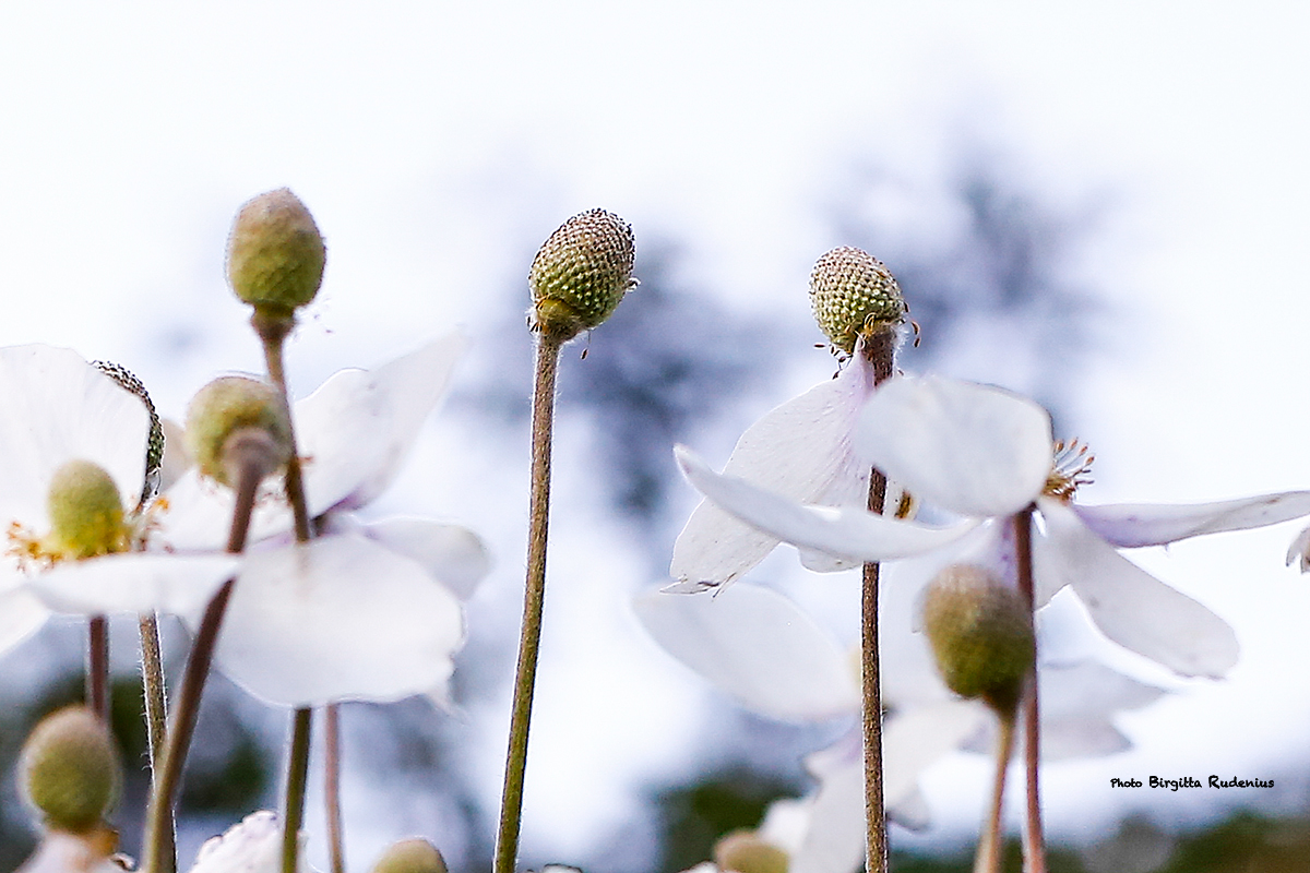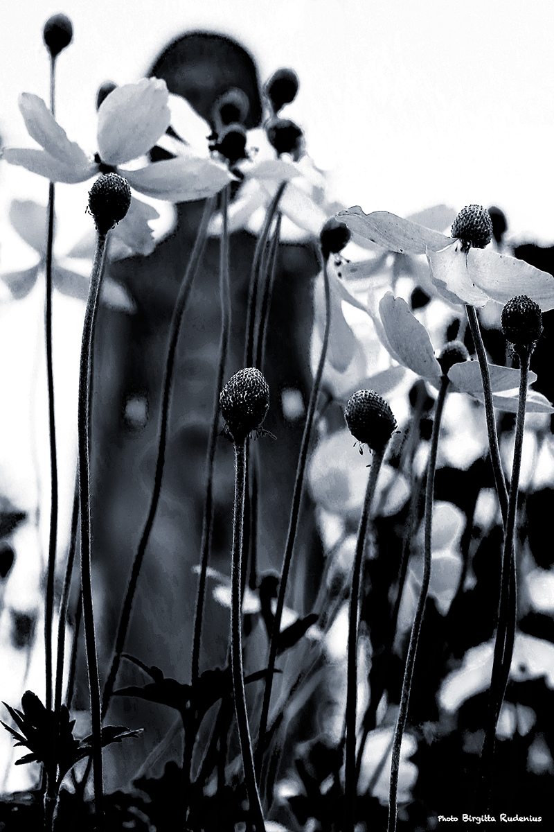 Det är bronsstatyn Kraka (1951) av Gustaf Nordahl som syns bakom blommorna. Lite underifrånperspektiv.