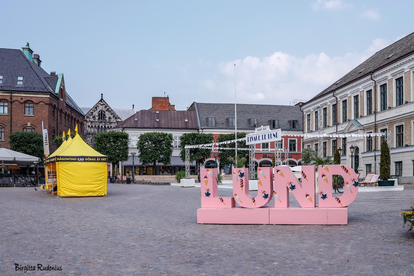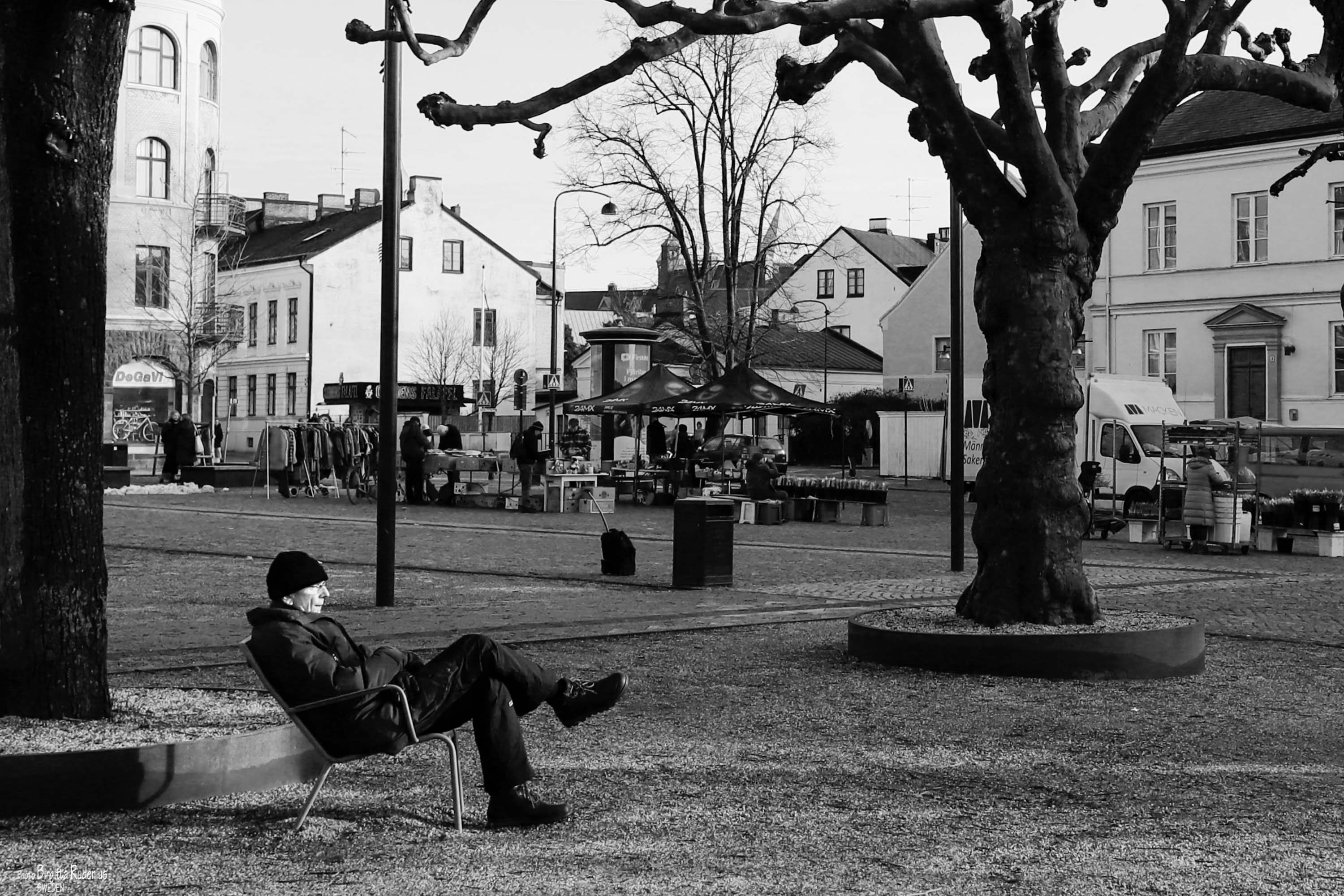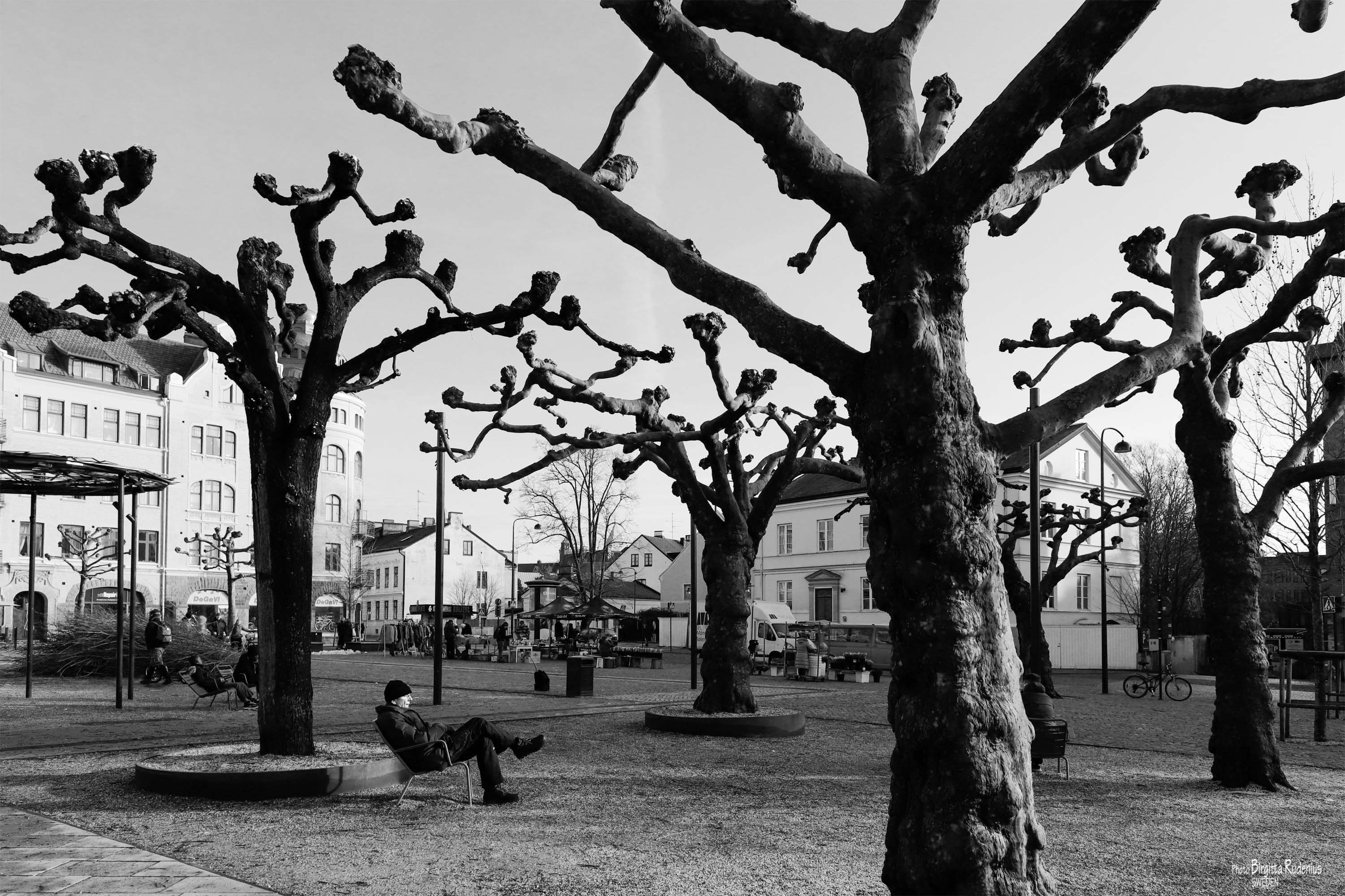 Detta är en del av det nyligen restaurerade Clemenstorget vid stationen i Lund – med fasta sittplatser här och där samt en vy över torghandeln . Till vänster utanför bilden startar den nya spårvagnen. Den invigdes i december 2020.