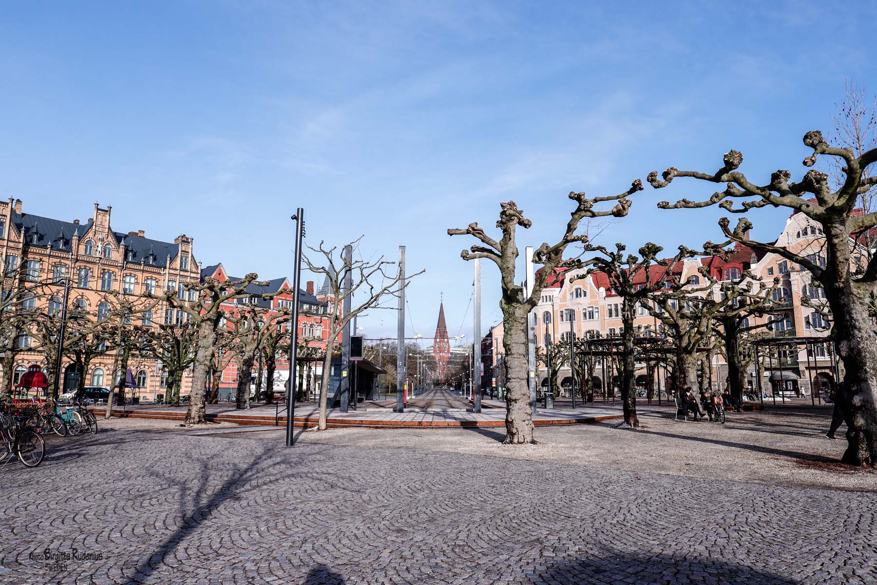 Här syns spårvägen – rakt mot Allhelgonakyrkan – fotograferad med ett 24mm objektiv (därav förvrängningen som inte justerats).