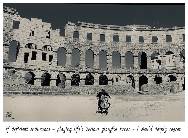 If deficient endurance – playing life’s various gloryful tunes – I would deeply regret.