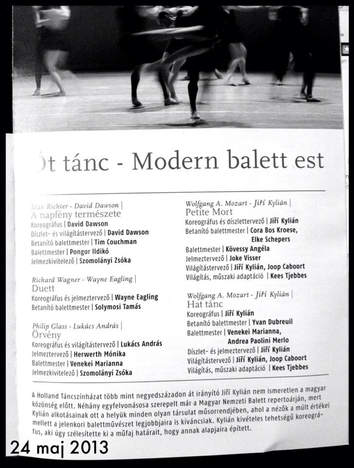 Alltså!!! Vilken bra föreställning! 5 moderna danser till musik av Richter/Dawson, Wagner, Glass/András och 2 av Mozart. Modern dans med klassisk skolning är min favorit. Ett eller kanske två av paren var helt suveräna – de var ”ett” i sin dans med varandra. Sedan är ungrarna så roliga. De bjuder på roligheter så publiken skrattar glatt. Har någon sett det i klassiska uppföranden hemma? Särskilt Mozart-avsnitten var busiga vilket passar för en busig Mozart. Barnen som var med skrattade särskilt hjärtligt. Här är barnen nämligen med i kultursammanhangen.